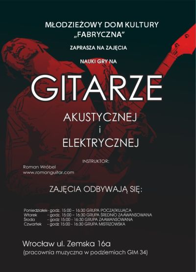 Młodzieżowy Dom Kultury "FABRYKA" zaprasza na zajęcia nauki gry na gitarze akustycznej i elektrycznej, Wrocław ul. Zemska 16a.