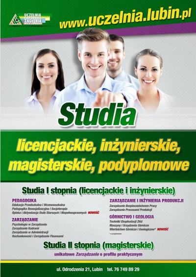 Rekrutacja na studia w lubińskiej Uczelni już się rozpoczęła i potrwa do połowy września lub do wyczerpania limitu miejsc. Uczelnia nie prowadzi egzaminów wstępnych a o przyjęciu na studia decyduje kolejność zgłoszeń.