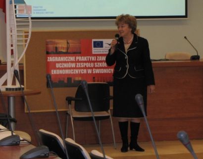 Dr Irena Tomys - Kanclerz Wyższej Szkoły Handlowej we Wrocławiu odebrała z rąk Pana Krzysztofa Osiaka - Dyrektora Zespołu Szkół Ekonomicznych im. Wincentego Stysia w Świdnicy Certyfikat "Przyjaciela szkoły" w dowód uznania za udzielane wsparcie. Podczas Konferencji podsumowującej wyjazdy na staże uczniów ZSE w Świdnicy do Portsmouth w Wielkiej Brytanii, Kanclerz WSH wygłosiła przemówienie nt. międzynarodowości.