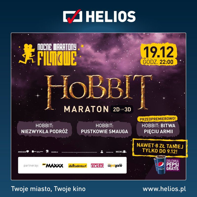 Start: 19.12. godz. 22.00, Meta: 20.12 godz. 6.30. Hobbit: Niezwykła podróż, Hobbit: Pustkowie Smauga, Hobbit: Bitwa pięciu armii (Przedpremierowo). Do wyboru wersja 2D lub 3D !!!