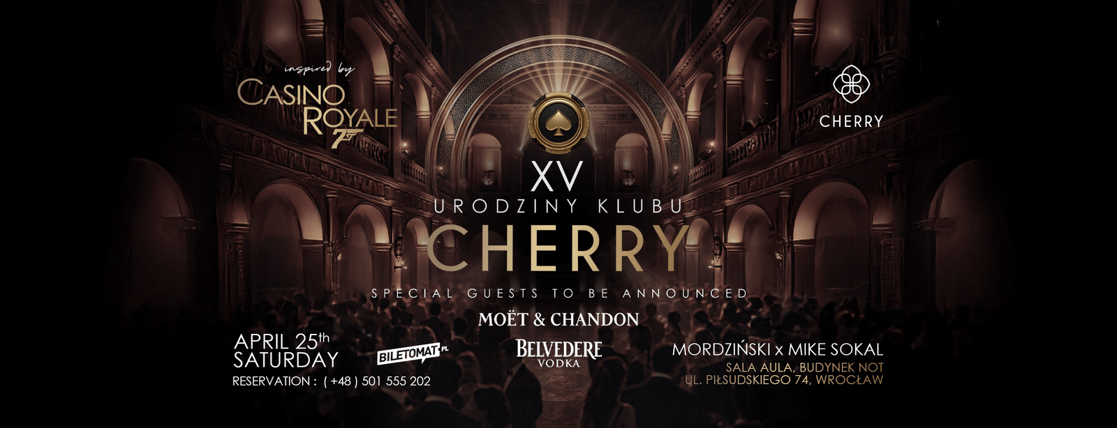 Tego wieczoru przenosimy się w klimat Casino Royale. Elegancja, styl i noc pełna wyjątkowych emocji. Przygotujcie się na celebrację w najlepszym wydaniu: świetną muzykę, wyjątkowych gości i atmosferę, która od lat definiuje charakter Cherry.